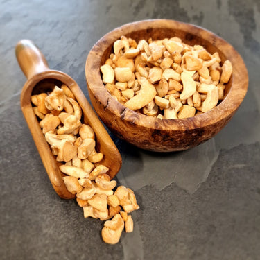 Roasted Cashew Pieces in various sizes. This product may have dark spots on the surface which come as part of the shelling process and does not affect the quality of the nut. The roasting process intensifies the flavour of the source material and makes it crunchier to the taste. It is a great value product for making your own butter, or if you wish to incorporate roasted cashew pieces into a meal. These pieces are un-graded misshapes are also known as LP's and LWP's (Large White Pieces) usually sized between 5mm and 20mm.