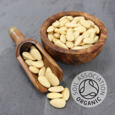 100% Organic Whole Blanched Almonds have been through a process of boiling and then rapid cooling to produce this product. The action taken removes the natural coating seen on the Shelled Almonds and leaves you with a white nut product, quite literally the meaning of "blanching". They maintain a good crunch and taste less "earthy" than their natural counterparts. Almonds provide a rich source of protein vitamin E, omega-6, iron, calcium and magnesium and antioxidants. These can be used in the bakery industry and in the production of paste, marzipan and fillings for chocolate pralines. Can be eaten as a snack, added to muesli, ground into flour or butter for cakes and breads and can even be used to make almond milk.