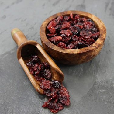 Dried Cranberries are infused with a sugar solution to increase their flavour before being dried. The quantity of sugar that has gone into them depends upon their origin. They are given a light spray of sunflower oil once they are dried to stop them from sticking together in transit. Cranberries are highly useful in many forms of cuisine. They can be eaten raw and so added to cereals to give an extra sweetness. Alternately they can be mixed into products to be baked, fruit scones for example.